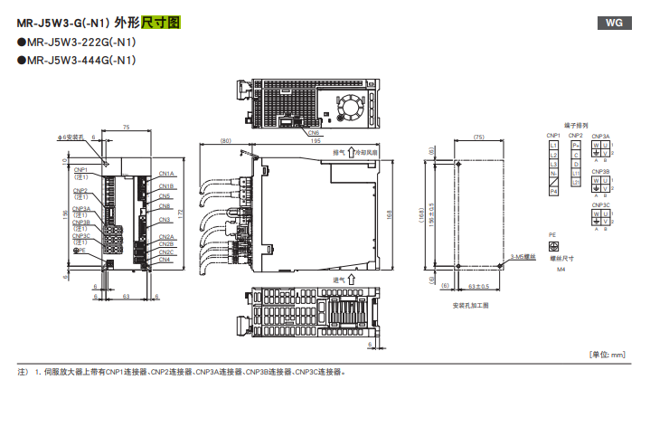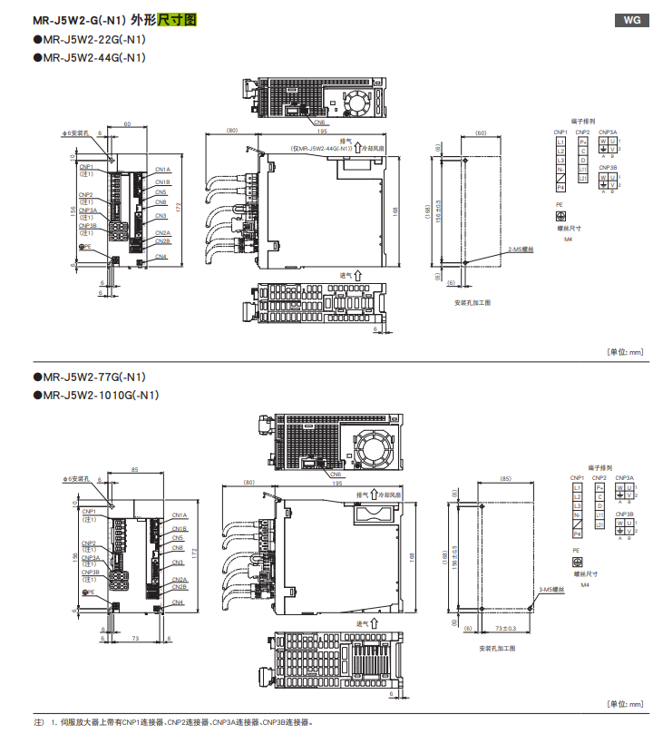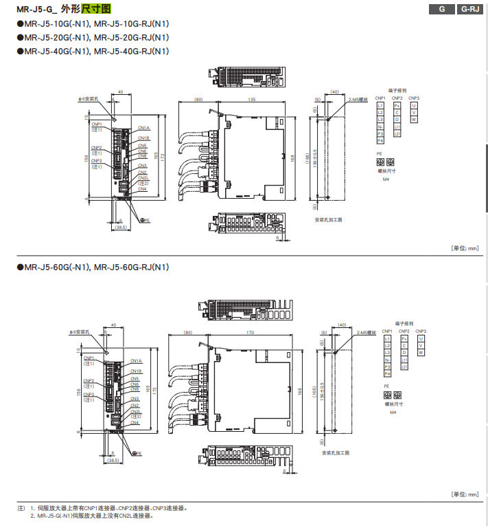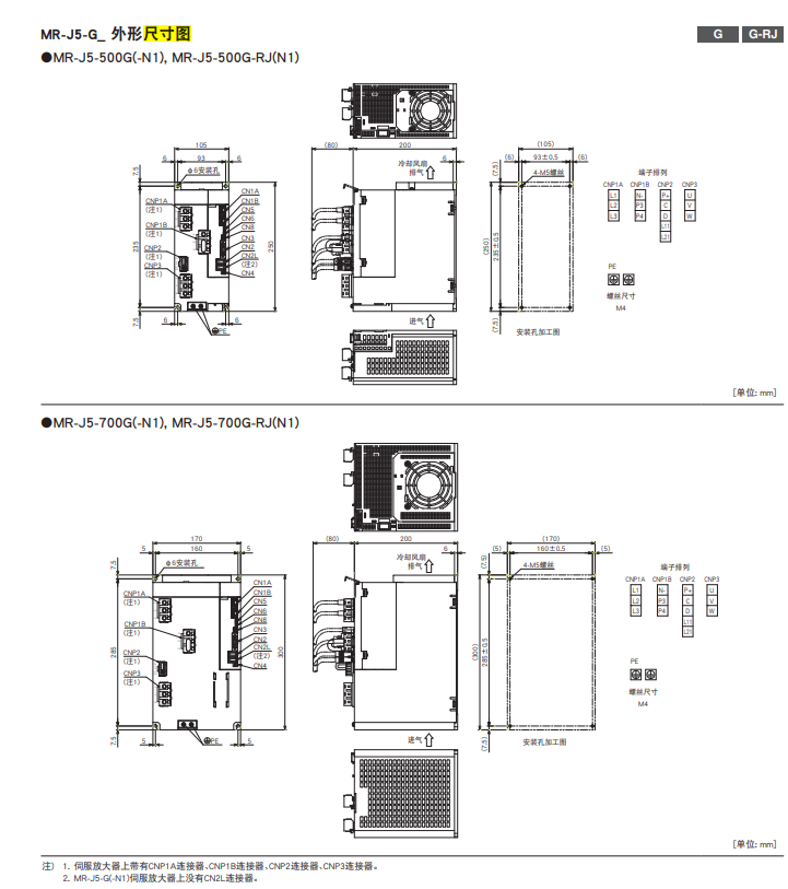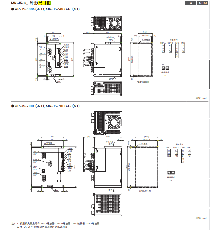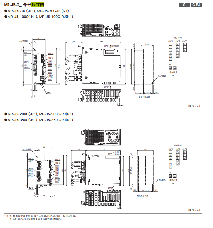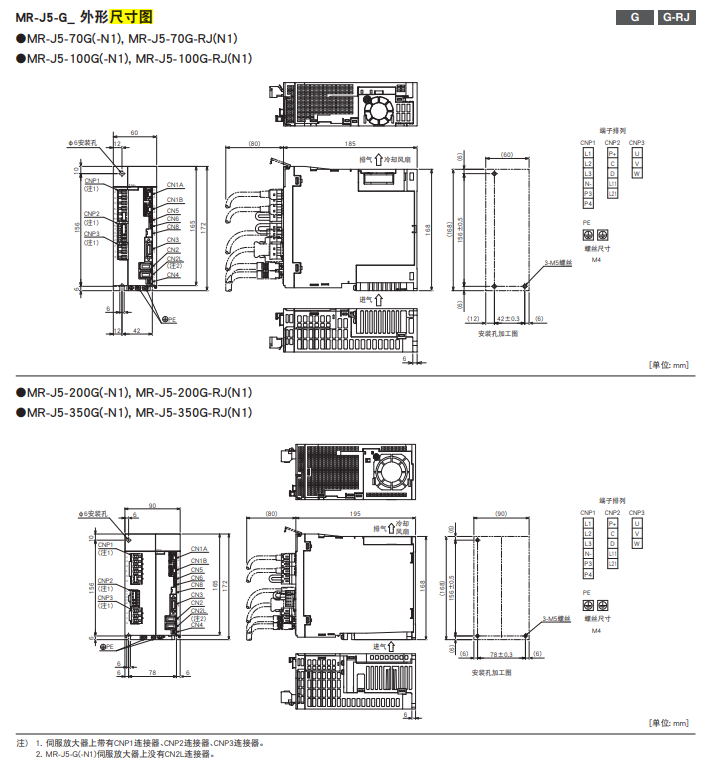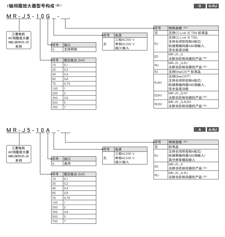 | 伺服放大器型號MR-J5-(-(RJ)(N1)) | 10G | 20G | 140G | 160G | 170G | 100G | 200G | 350G | 1500G | 700G | ||