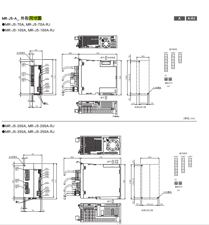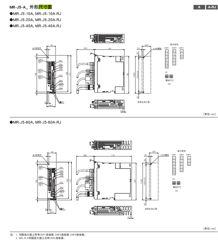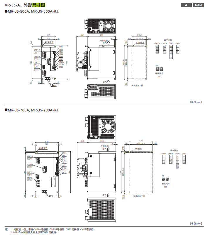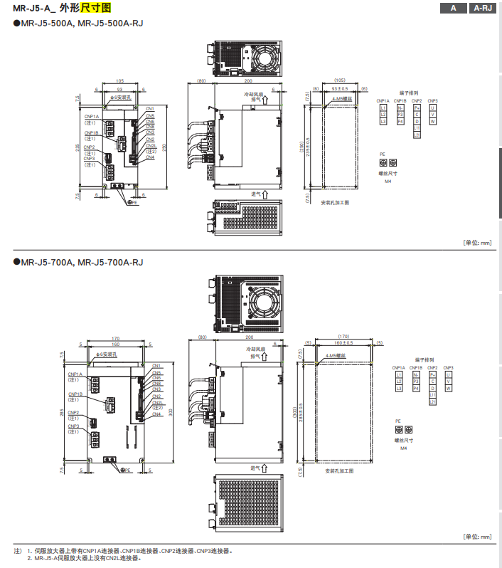 | 伺服放大器型號MR-J5-(-RJ) | 10A | 20A | 40A | 60A | 70A | 100A | 200A | 350A | 500A | 700A | ||