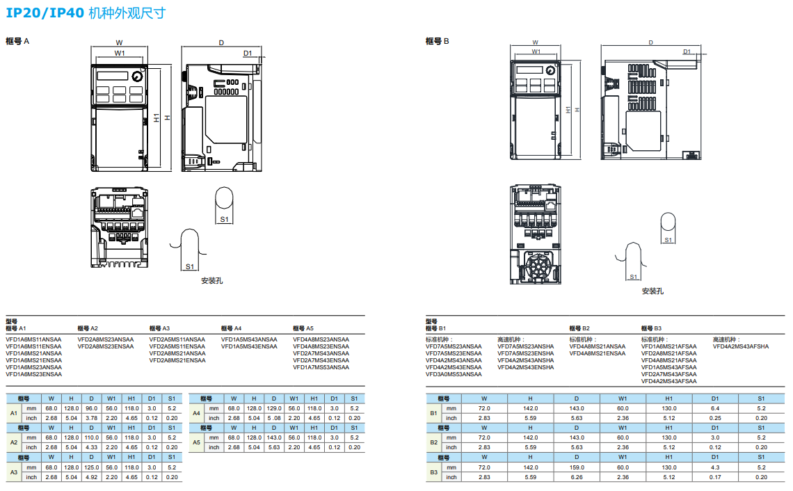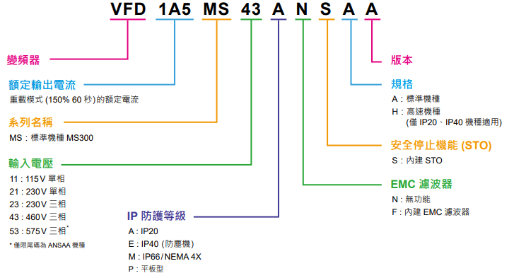 | VFD11AMS21MNSAA | 3 | 2.2 | 11 | 型號 | 額定 | 框號 | 內(nèi)置EMC 濾波器 | IP40 機種 | |||||