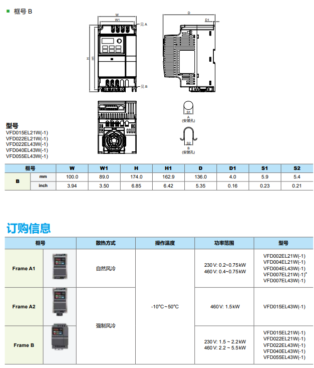 | 框號 B: | VFD015EL21W(-1 | 230 V: 1.5 ~ 2.2 kW 460 V: 2.2 ~ 5.5 kW |