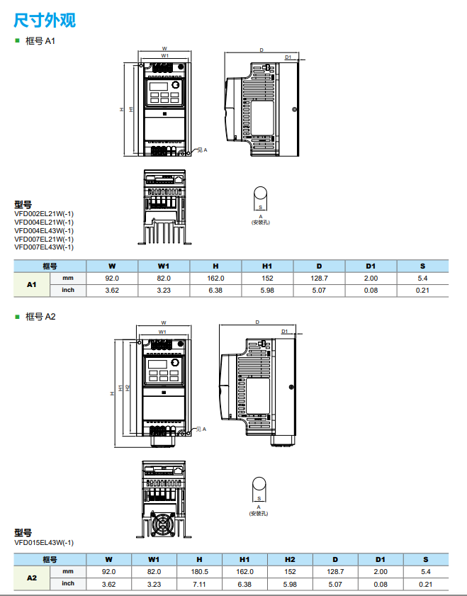 | 框號 A2: | VFD015EL43W(-1) | 460 V: 1.5 Kw | 強制風冷 | |