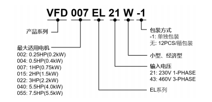 | 型號 | VFD-__EL21W(-1) | 002 | 004 | 007 | 015 | 022 | 004 | 007 | 015 | 022 | 040 | 055 |