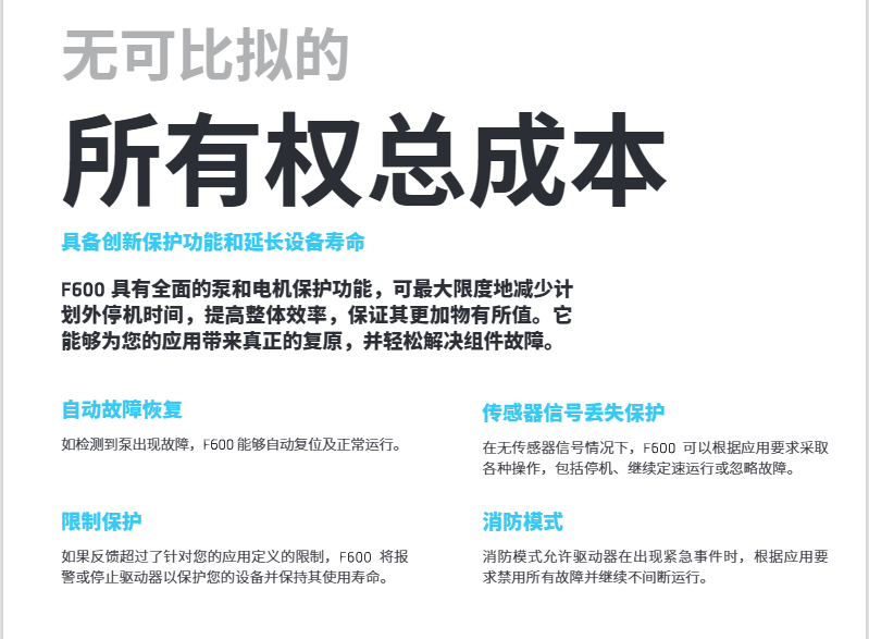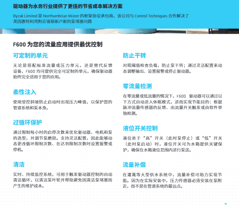 涉及水流的應用,需要極高的可靠性和低能耗。Control Techniques 的F600驅動器隸屬于新推出的行業(yè)專用系列,基于我們五十年的驅動專業(yè)知識打造,可提供可靠的流量控制。F600驅動器功能齊全,匯集了您所需的一切功能,而且功能說明通俗易懂。它并非附帶泵功能的通用驅動器,而是一種專用泵專用驅動器。 F600采用全新設計,可提供您所需的可靠性和效率.