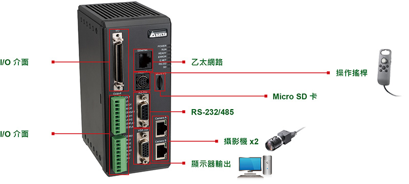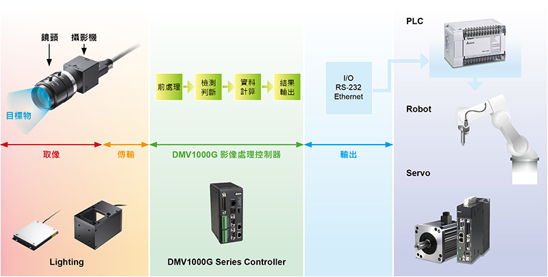 臺(tái)達(dá)機(jī)器視覺系統(tǒng) DMV1000G 系列提供人性化圖像處理接口,用戶可透過簡(jiǎn)單的步驟設(shè)定,即可利用高速傳輸速率的 GigE 接口數(shù)字?jǐn)z影機(jī)進(jìn)行影像擷取,取得影像后再由控制器內(nèi)部的高速視覺運(yùn)算處理系統(tǒng),執(zhí)行面積偵測(cè)、邊緣位置、距離、計(jì)數(shù)、角度、瑕疵、斑點(diǎn)、圖形比對(duì)、字符辨識(shí)、坐標(biāo)、角度運(yùn)算以及邊緣角度等功能,滿足各種多功能視覺檢測(cè)應(yīng)用。 DMV1000G 系列不僅擁有智能化的圖像處理功能,更包含多點(diǎn) I/O 輸入輸出接口,用戶可方便鏈接外部傳感器信號(hào)、光源觸發(fā)、攝影機(jī)取像觸發(fā)、數(shù)據(jù)鏈路等應(yīng)用,降低硬件上的建構(gòu)成本。DMV1000G 系列提供業(yè)界大宗的工業(yè)網(wǎng)絡(luò)接口,如:RS232、RS485、Ethernet 與 I/O 接口等,將視覺系統(tǒng)的檢測(cè)數(shù)據(jù)與判斷結(jié)果快速且精準(zhǔn)的傳送至上位控制器。 此外,針對(duì)視覺系統(tǒng)所需配件,臺(tái)達(dá)亦提供攝影機(jī)、鏡頭、光源等,讓使用者能夠簡(jiǎn)單、快速地架構(gòu)高精度、靈活性、網(wǎng)絡(luò)型的全自動(dòng)化機(jī)器視覺系統(tǒng)。