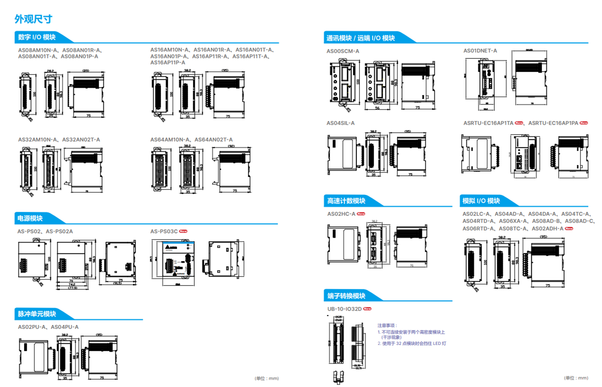| 通訊擴(kuò)展模塊 | AS00SCM-A | 2 | 0.6w | RS-232 / RS-422 / RS-485(搭配 AS-F232 / 422 /485) CANopen - Slave 與 RTU 模式 (搭配 AS-FCOPM) Ethernet - EtherNet/IP RTU 模式(搭配 AS-FEN02) PROFINET - PROFINET RTU 模式(搭配 AS-FPFN02) |