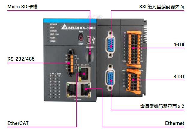 ● 內(nèi)置6?~?16 DI?/?6?~?8 DO、增量型編碼器、SSI編碼器、RS-232/422?/?485、Ethernet與EtherCAT等界面