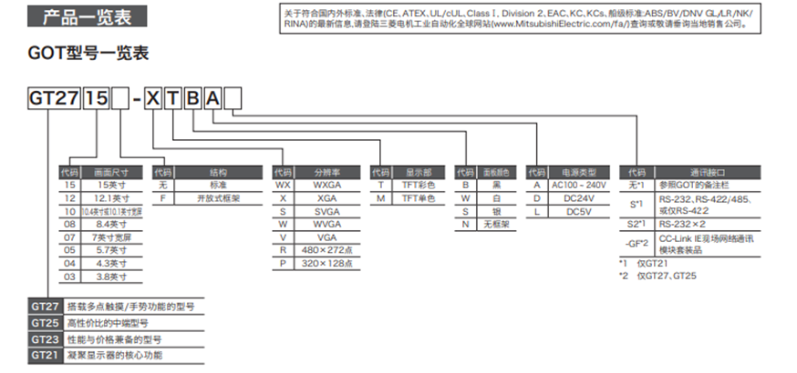 | GT2510-WXTBD | GT25:高性價比的中斷型號 | 10.1英寸 | 例:GT2507-WTBD √無(標準); F(開放式框架) | WXGA:1280×800點 | 例:GT2715-XTBD T(TET彩色);M(TFT單色) | 例:GT2715-XTBD B黑 W白 S銀 N無框架 | 無 | 例:GT2715-XTBD. 無*1:參照GOT的備注欄; S*1:RS-232、RS-422/485、或僅RS-422;S2*1:RS-232*2; -GF*2:CC-Link IE 現(xiàn)場網(wǎng)絡(luò)通訊模塊套裝品 |